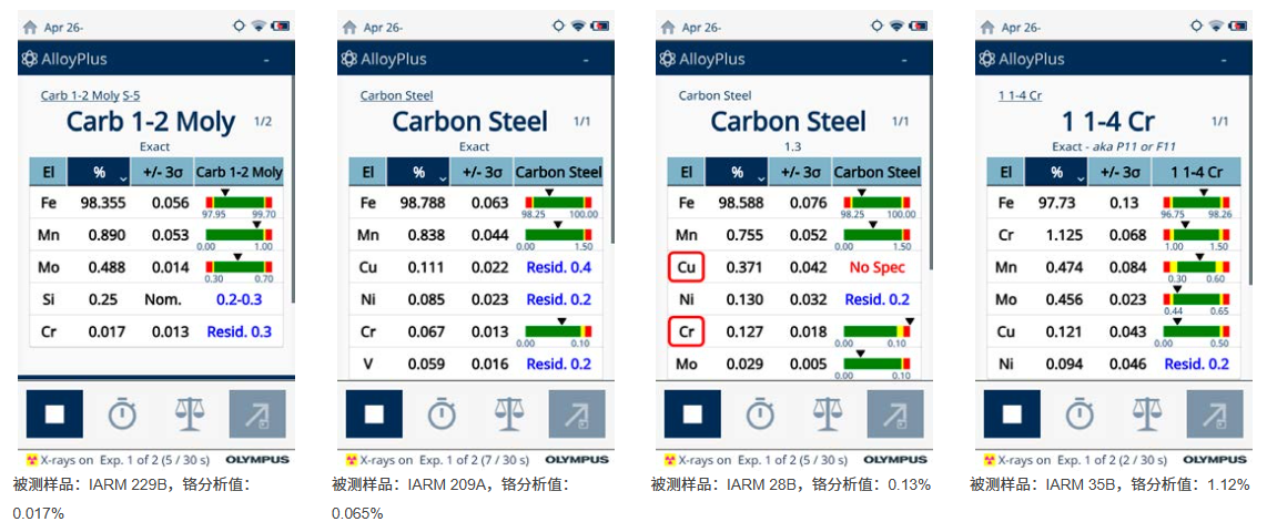 下面幾張圖是Vanta分析儀在對(duì)碳鋼中的鉻進(jìn)行分析的過(guò)程中,顯示在分析儀屏幕上的結(jié)果。在這些圖像中我們可以看到,7秒鐘之內(nèi),屏幕上就顯示了預(yù)測(cè)流動(dòng)加速腐蝕所需的鉻含量讀數(shù)。