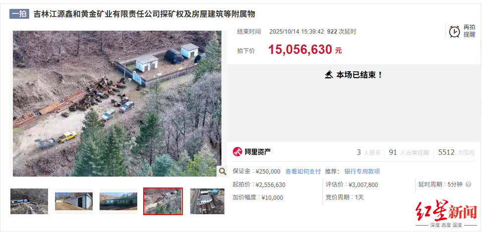 紅星資本局近日消息,吉林江源鑫和黃金礦業(yè)有限責任公司探礦權(quán)及房屋建筑等附屬物在阿里資產(chǎn)拍賣平臺被拍賣,本次拍賣經(jīng)過931輪出價(包括922次延時出價),最終以1505.663萬元的價格成交,對比起拍價255.663萬元,溢價1250萬元,溢價率達489%。